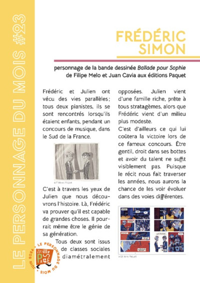 Le récit navigue entre le passé et le présent avec l’aide d’Adeline Jourdain, une jeune journaliste venue interviewer Julien Dubois, célèbre compositeur solitaire et acariâtre. Mais celui-ci ne voudra dévoiler son histoire que s’il peut parler de son plus grand rival: Frédéric Simon. Les auteurs ont choisi un axe très cinématographique, qui fonctionne très bien avec le style graphique de Juan Cavia. Un découpage simple et des couleurs chaudes nous plongent dans ce récit, qui nous parle de musique, de rivalité et d’amour. Nous voilà transportés des années 1930 jusqu’aux années 1970 dans un récit fleuve émouvant. La bande dessinée nous propose une ambiance nostalgique avec des personnages humains et attachants.
