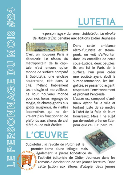Sublutetia : la révolte de Hutan est le premier tome d’une trilogie, mais également la pierre fondatrice de l’activité éditoriale de Didier Jeunesse dans les romans à destination de ses jeunes lecteurs. Dans cette fiction aux allures d’utopie, deux jeunes enfants, Nathan et Keren, découvrent l’existence d’une cité cachée sous Paris, à la faveur d’une rame de métro loupée. Séparés du reste de leur classe, ils devront affronter leurs peurs et leur passé, mais également de terribles adversaires qui n’ont rien de métaphorique et sont de chair et d’os. Écrit tout en finesse, loin des héros caricaturaux et des méchants très très méchants, le roman sait poser des nuances et rendre hommage aux classiques. Entre Jules Verne et La Planète des singes, voici des protagonistes qui évoluent et s’étoffent au fil des pages pour traiter de la nature humaine et de sa complexité.
