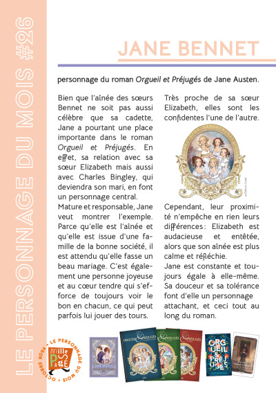 Bien que l’aînée des sœurs Bennet ne soit pas aussi célèbre que sa cadette, Jane a pourtant une place importante dans le roman Orgueil et Préjugés. En effet, sa relation avec sa sœur Elizabeth mais aussi avec Charles Bingley, qui deviendra son mari, en font un personnage central. Mature et responsable, Jane veut montrer l’exemple. Parce qu’elle est l’aînée et qu’elle est issue d’une famille de la bonne société, il est attendu qu’elle fasse un beau mariage. C’est également une personne joyeuse et au cœur tendre qui s’efforce de toujours voir le bon en chacun, ce qui peut parfois lui jouer des tours. Très proche de sa sœur Elizabeth, elles sont les confidentes l’une de l’autre. Cependant, leur proximité n’empêche en rien leurs différences : Elizabeth est audacieuse et entêtée, alors que son aînée est plus calme et réfléchie. Jane est constante et toujours égale à elle-même. Sa douceur et sa tolérance font d’elle un personnage attachant, et ceci tout au long du roman.
