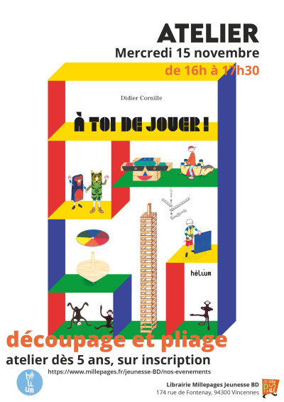 Nous vous invitons à un atelier de découpage et pliage autour du livre À toi de jouer ! de Didier Cornille aux éditions hélium !