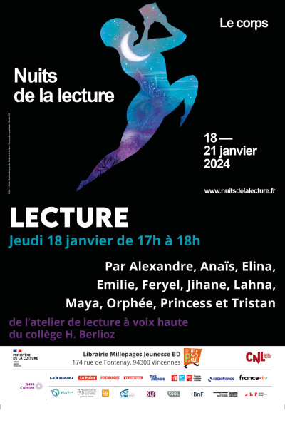 Venez à la librairie écouter les élèves de l'atelier de lecture à voix haute du collège H. Berlioz nous lire des textes sélectionnés par eux autour de la thématique du corps dans le cadre de la Nuit de la Lecture.